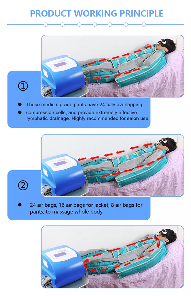 Air Pressure Massage: This is one of the core features of 3 in 1 Air Pressure Body Infrared Pressotherapy. Through a special air pressure bag, the device can produce periodic air pressure changes to simulate the effect of manual massage. This massage method can not only penetrate deep into muscle tissue and relax tense muscles, but also promote blood circulation and relieve fatigue.Infrared heat therapy: On the basis of air pressure massage, the equipment also adds infrared heat therapy technology. Infrared light can penetrate deep into skin tissue, produce a warming effect, accelerate blood circulation, and promote metabolism. This warming effect can also relieve muscle tension and relieve pain, giving users a more comfortable experience.