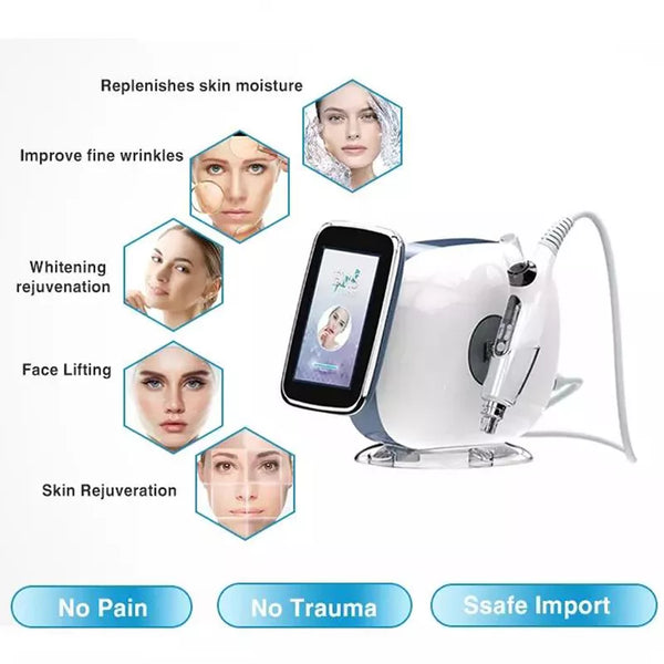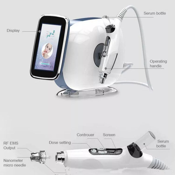 Use the wispy needle of the micro crystal head to penetrate into the cuticle of skin, opening the pore of the epidermal layer of skin, injecting the active ingredient of nutrition. Therefore, it can repair aging skin and reborn collagen, remove wrinkles and spots, improve skin complexion and lift face.