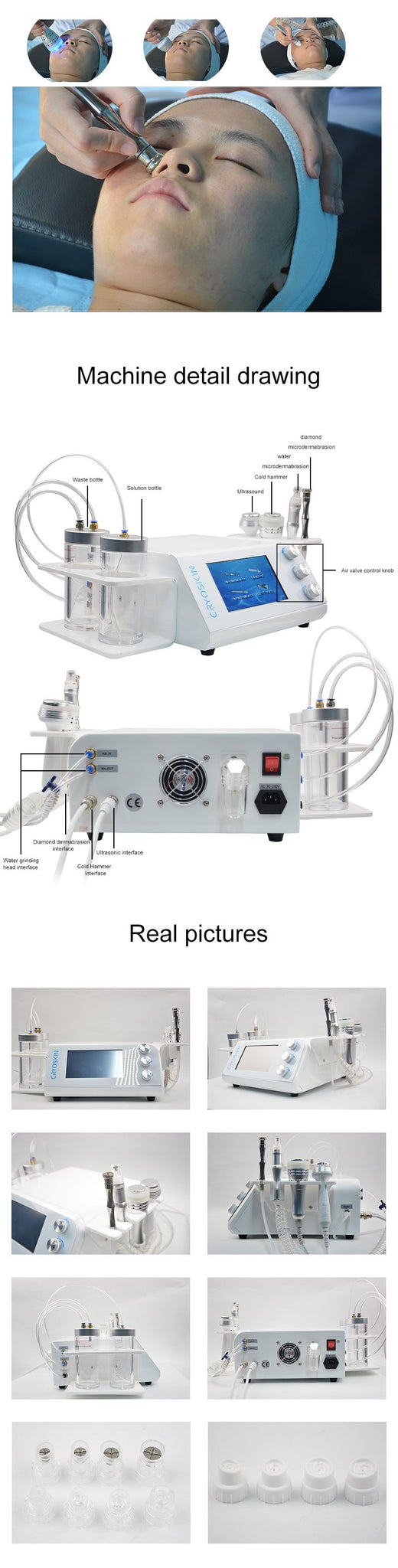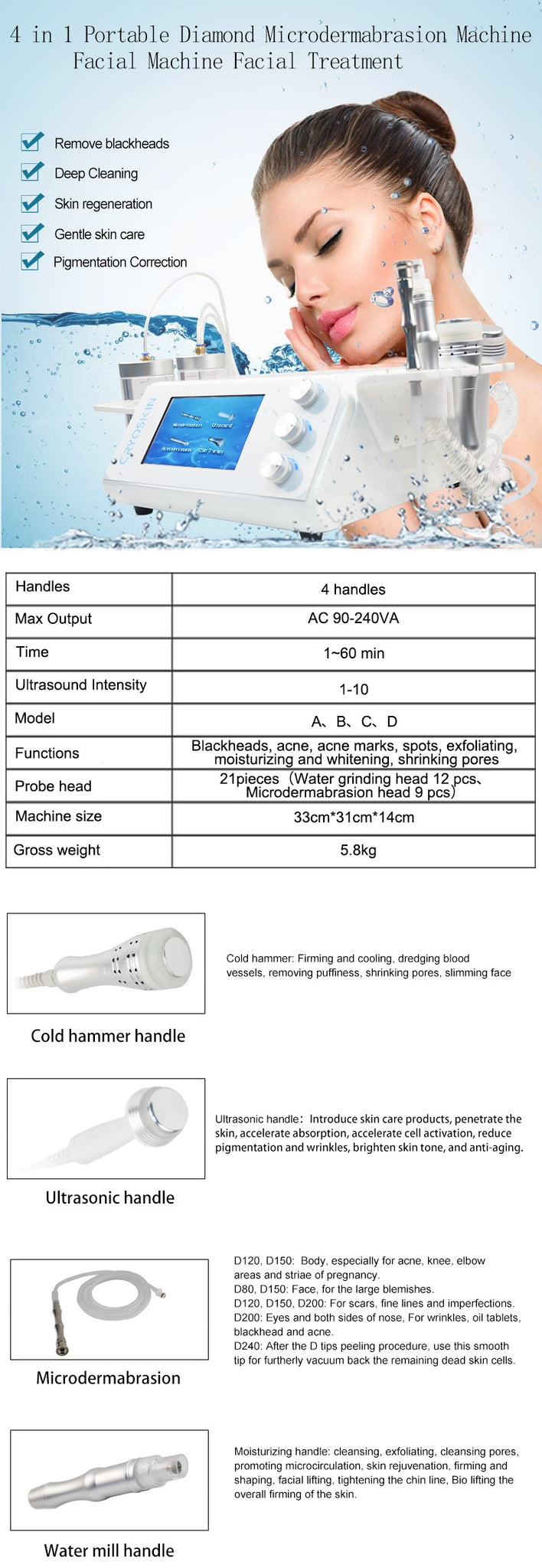 | Probe Head | 21 pieces (Water grinding head 12 pcs, Microdermabrasion head 9 pcs) |