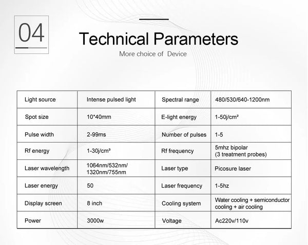 | Handles | 1× OPT SHR, 1× RF, 1× Picosecond Laser |