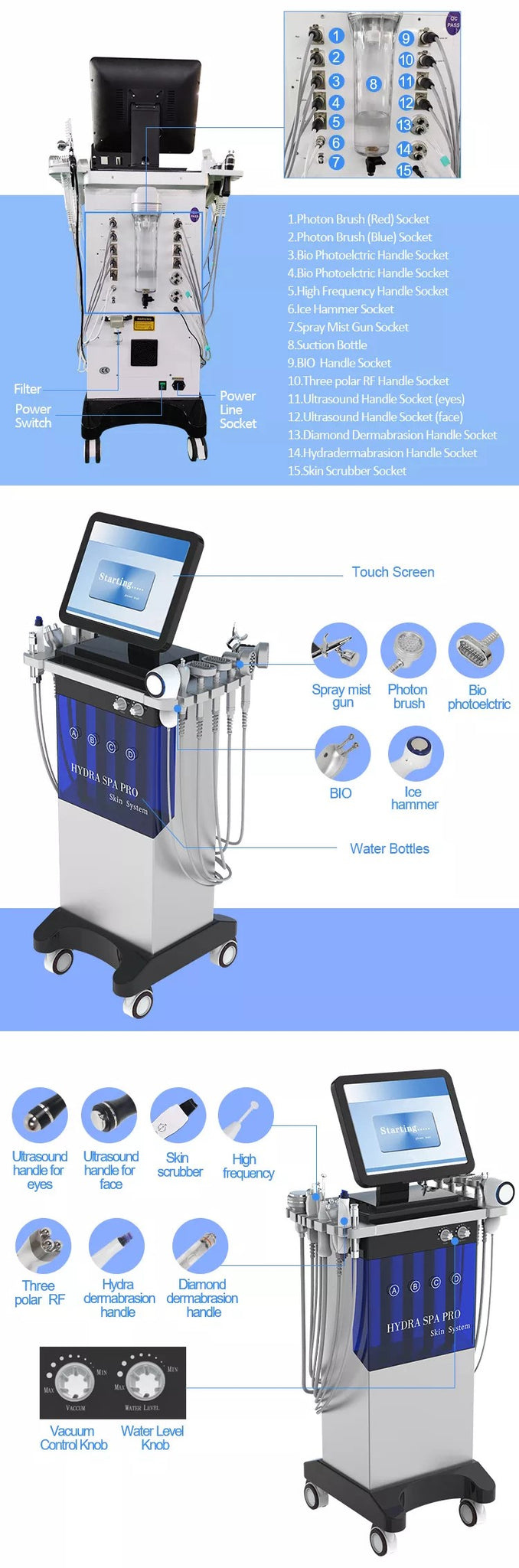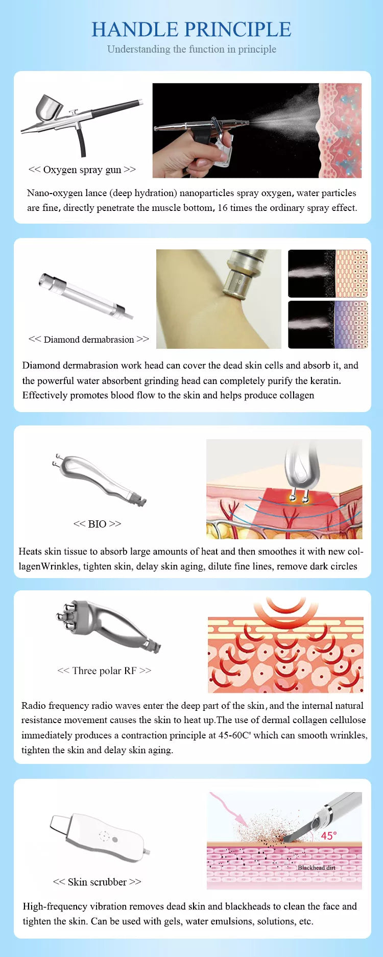 Hydrodermabrasion with 8 tips Diamond dermabrasion with 9 tips Spray mist gun ×1 BIO ×1 Three polar RF ×1 High frequency handle ×1 Ultrasound handle ×2 Bio photoelectric ×2 Skin scrubber ×1 Photon brush ×2 |