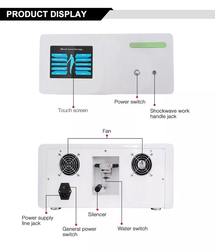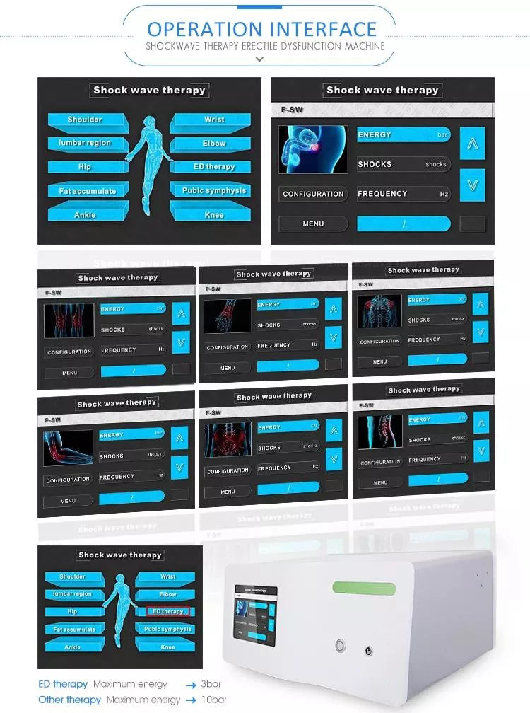 Shockwave therapy equipment can cover most typical applications includes Epicondylitis, Tendonitis, Biceps Tendonitis, Achilles Tendonitis, Lower Back Pain of muscular origin, Trigger Points, Plantar Fascitis, and aesthetic applications as Cellulite therapy and body reshaping. It is widely installed for treatment target which covers: rehabilitation medical, orthopedics, sport medicine, medical cosmetology, pain treatment (chronic/acute), dermatology, geriatrics, etc.
