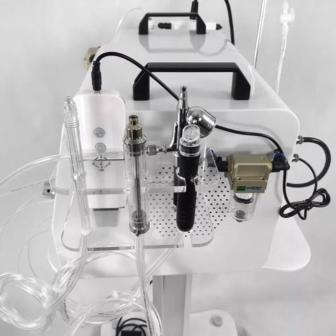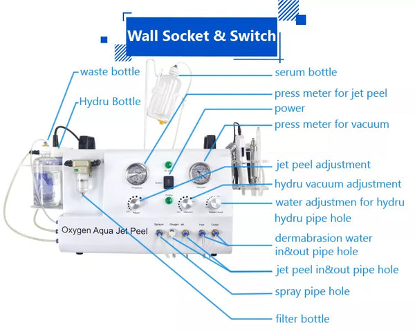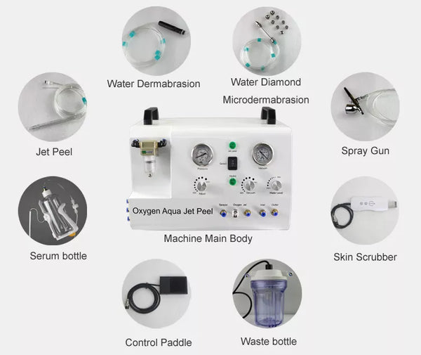 1) 4 Bar jet peel handpiece (3 pores) 2) Water dermabrasion wand 3) Diamond water dermabrasion wand (optional) 4) Spray gun 5) Skin scrubber |