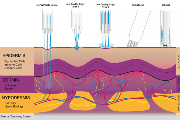 The Jet Peel combines oxygen and saline, and creates a jet stream of micro-droplets. The Jet power reaches a velocity of up to 600 ft/sec, this powerful but, yet, gentle jet stream is used to exfoliate the skin’s surface without causing irritation. Reaching a skin depth of up to 4.5 mm (3/16″). Jet Peel infusion can reach the dermal layer of the skin where the skin is cleansed, exfoliated, and infused with serums to stimulate collagen and elastin.