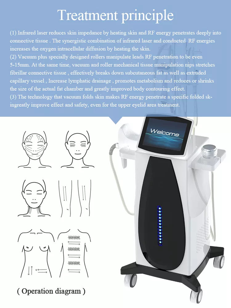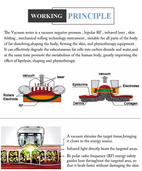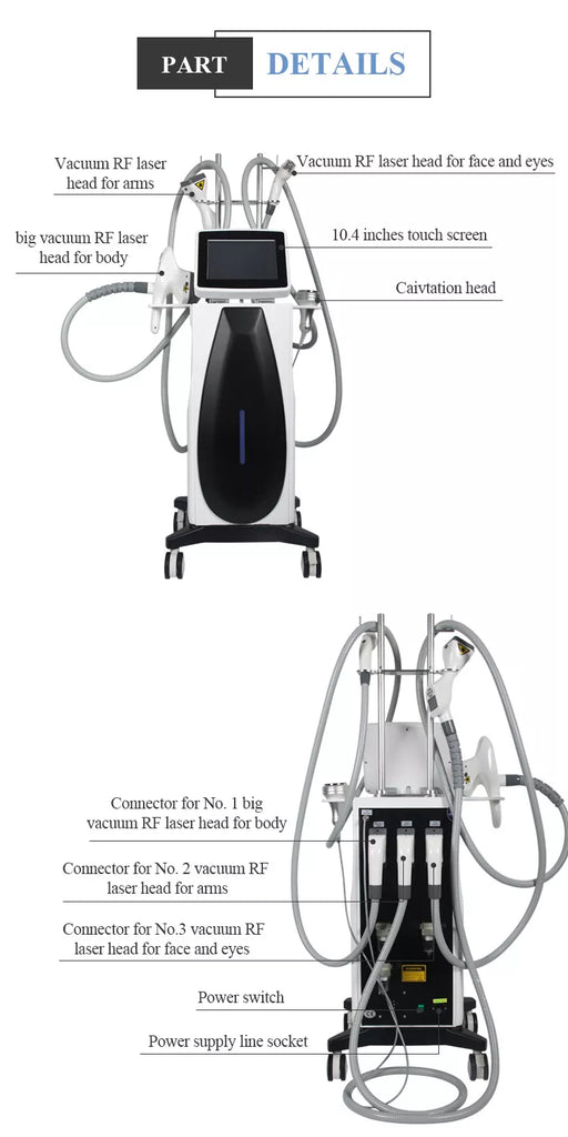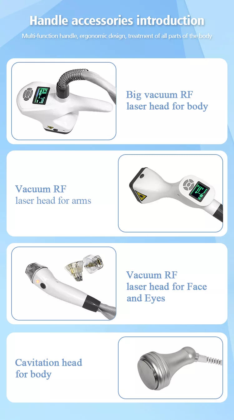Big vacuum RF laser head for body *1 Vacuum RF laser head for arms *1 Vacuum RF laser head for face and eyes *1 Cavitation head for body *1 Power cord *1 |